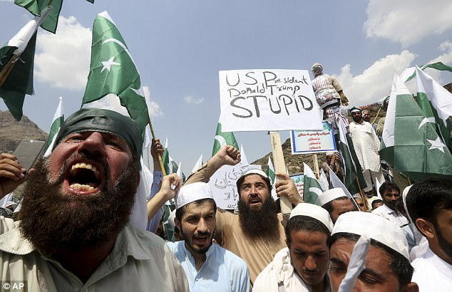 | (Photos) Pakistani mob burn effigy of Donald Trump | Mr Olumide's Blog Posted: 29 Aug 2017 03:09 AM PDT A furious Pakistani mob burned an effigy of Donald Trump during a rally against the US a week after he slammed Islamabad for harbouring terrorists. Pictures have emerged of the figure depicting the President engulfed in flames as the cheering crowd hoist Pakistani flags in the air. Other demonstrators punched the air and held up placards reading, 'US President Donald Trump (is) stupid.' culled from MPNB Mr Olumide's Blog |